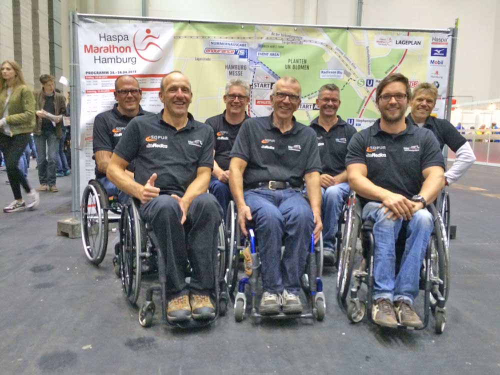 Das Kunststück, beim ersten Marathon der Handbike Trophy Serie gleich mit dem kompletten Team am Start zu sein, war schon etwas Besonderes und wurde auch gleich beim Treffpunkt in den Messehallen im Bild festgehalten. Die Anspannung bei uns Fahrern vor dem ersten Aufeinandertreffen mit den besten Handbikern aus Deutschland und den Nachbarländern war schon deutlich zu spüren.